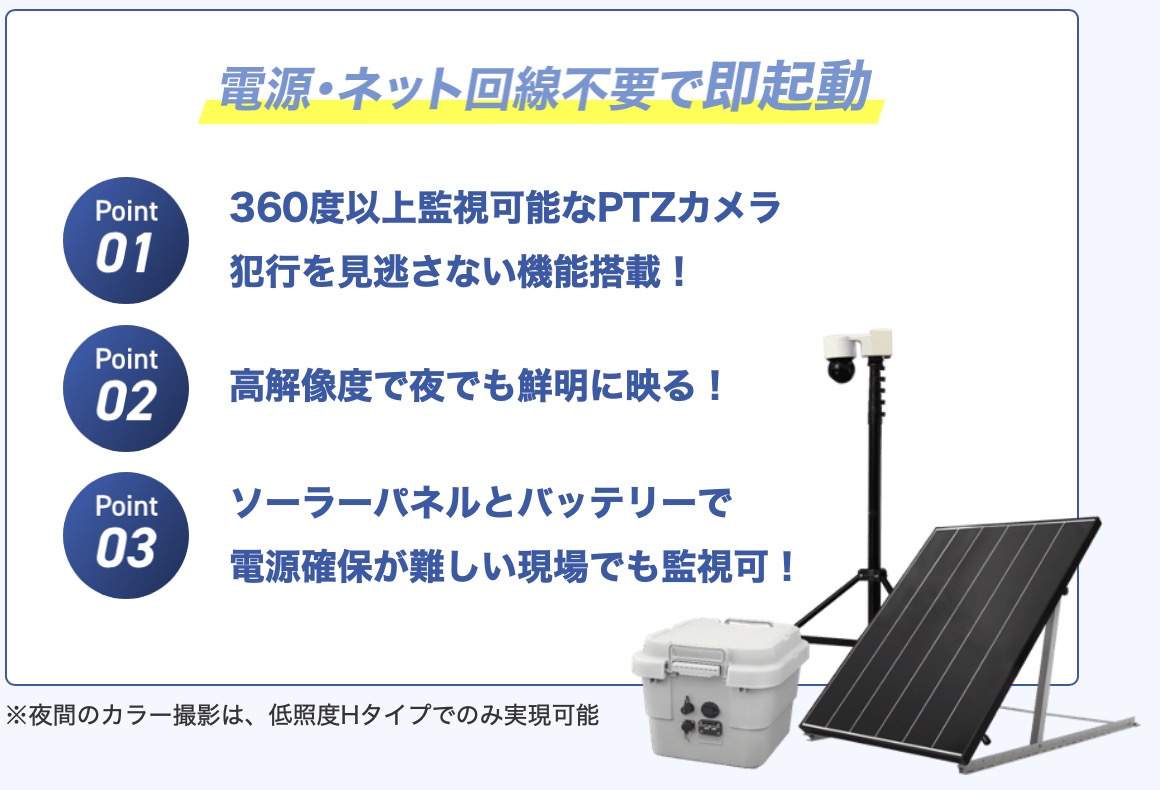 電源環境が無いという制約がある場所でも、すぐに設置・稼働できるため、現場の安全管理や資産保護に最適です。